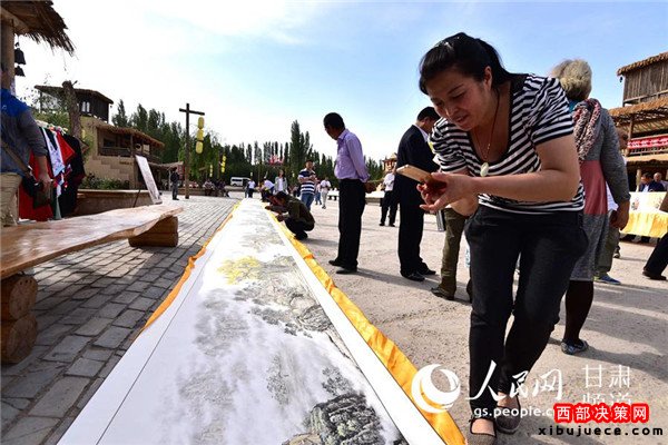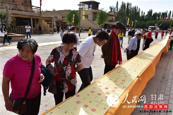 19日上午,在首屆絲綢之路(敦煌)國際文化博覽會(huì)召開之際,由敦煌正覺寫經(jīng)院打造的篆刻《道德經(jīng)》百米長(zhǎng)卷在敦煌月牙泉小鎮(zhèn)亮相,“獻(xiàn)禮”文博會(huì)。