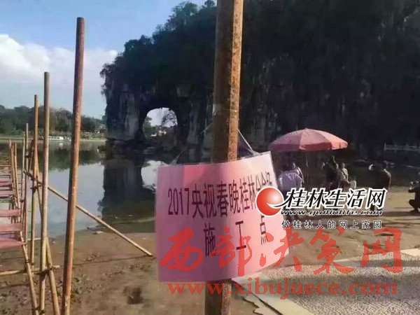 為了真正體現(xiàn)東西南北中,全民大聯(lián)歡,2017年央視春晚延續(xù)2016年春晚特色,特別設(shè)置了東西南北四大分會(huì)場(chǎng),桂林憑借秀美的山水風(fēng)光和厚重的歷史文化底蘊(yùn),被確定為2017年央視春晚南方分會(huì)場(chǎng)。17日上午,景俊海一行來到2017年央視春晚桂林分會(huì)場(chǎng)外景地象山景區(qū)。象鼻山被薄霧籠罩,如夢(mèng)似幻,漓江煙波渺渺,美不勝收,山水和諧相融構(gòu)成了中國南方最具代表性的自然美景。從11月12日起,春晚桂林分會(huì)場(chǎng)舞臺(tái)搭建工作已經(jīng)進(jìn)場(chǎng),工人正在用一根根鋼管搭建水上舞臺(tái)。