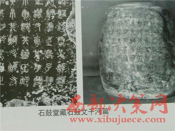 曹老早在40多年前就潛心鉆研石鼓。唐627年,陜西寶雞岐山北坡的荒郊首次發(fā)現(xiàn)石鼓。此地曾是秦朝舊地。共十枚,髙約2尺,徑約3尺,分別刻有大篆四言詩一首,共十首,計(jì)718字。定名:車工、千沔、田車、鑾車、霝雨、乍原、吳人、而師、馬薦、吾水。內(nèi)容最早被認(rèn)為是記敘周宣王出獵的場面,后有專家論證為秦時(shí)記敘游獵的遺物,故稱“獵碣”。