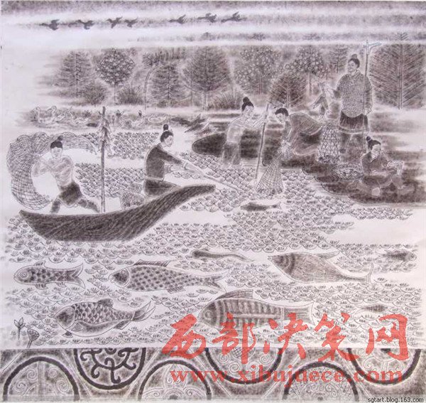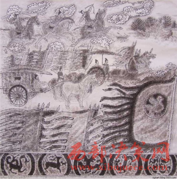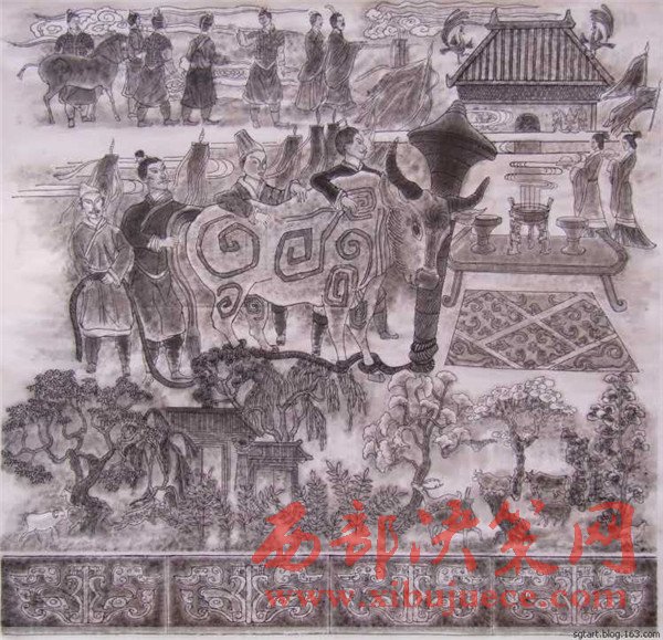 曹老經(jīng)過深思熟慮后1989年作出第一幅石鼓畫像,但他并不滿意。石鼓文的博大精深、源遠(yuǎn)流長豈能是他輕易能描繪得出來的!他覺得自己還沒有吃準(zhǔn)石鼓文的深邃含義。他明白:淺薄自滿是藝術(shù)的致命傷,能對(duì)自己自省和不滿的人,才會(huì)創(chuàng)作出能經(jīng)得起時(shí)間和歷史檢驗(yàn)的藝術(shù)佳作。曹老痛下心撕了又畫,兩易其稿后,心里還不踏實(shí),他必須尋找“最為挑剔的眼睛”。于是,他帶著十幅畫作,趕赴京城,讓石鼓專家鑒定審核。果不其然,專家們給他指出了一些問題:畫的時(shí)間不對(duì),人物衣著不符合朝代特征。曹老虛心聽取了專家的意見,他返回寶雞,廢棄了原稿,重新考證人物的歷史特征,生活細(xì)節(jié)的一點(diǎn)一滴。他為了能精確地描繪先秦時(shí)期的人物和服飾,甚至每一件物件、器皿、圖案,他借來了秦兵馬俑博物館的圖像和資料,依據(jù)兵馬俑中人物的衣著打扮,紋飾車馬,2000年之后,第三次拿起筆重新準(zhǔn)確地描繪出了十面石鼓中的眾多人物、眾多民俗風(fēng)情。為了讓《石鼓文圖》經(jīng)受更嚴(yán)格的“審批”,曹老并沒有急于發(fā)表,而是連續(xù)奔波了幾年,直到2007年終于定稿與世人見面。