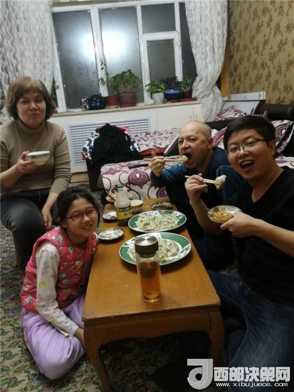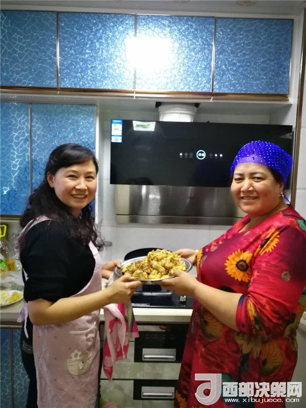 艾來提·賽買提的父親賽買提·阿合買提一面接過韓莉書記手里的米、面、清油和兩大兜食材,一面心疼地埋怨:“這么冷的天,你們又拿這么多東西,多辛苦,你上次送來的東西還沒有吃完呢。”韓莉和王艷萍笑而不語,心里默默地盤算著帶給親戚意外的驚喜。因為艾來提·賽買提和愛人長期兩地分居,聚少離多。今天正好是他們父母結(jié)婚三十周年紀(jì)念日,她們?nèi)嗽缇蜕塘亢靡欢ㄒH手做一頓飯,邀請這個民族團(tuán)結(jié)大院里附近的同事和各自的親戚一起來給這個小家庭舉辦一場別開生面的大融合聚會,她們忙碌著,擇、洗、炒,撲鼻的香味彌漫在親戚的家中……