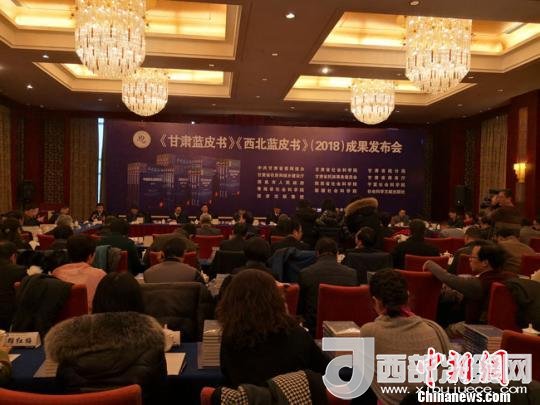 1月8日,2018年度《甘肅藍(lán)皮書》、《西北藍(lán)皮書》成果發(fā)布會在蘭州舉行。圖為發(fā)布會現(xiàn)場。馮志軍攝