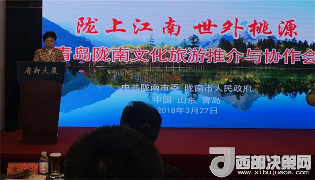 3月27日,在青島市府新大廈舉辦了青島隴南文化旅游推介與協(xié)作會,隴南市人大常委會主任、市委秘書長岳金林、隴南市政協(xié)主席張昉、隴南市委常委、常務(wù)副市長張慶宏、隴南市委常委、宣傳部部長李興華、隴南市副市長徐世林、隴南市政府黨組成員、市委副秘書長、市政府副秘書長殷世逸、隴南市政府黨組成員、市政府副秘書長苑曉輝、隴南市委宣傳部副部長、精神文明辦主任周立鈞、隴南市文廣新局局長汪小娟、隴南市旅游局局長毛樹林及市旅游開發(fā)領(lǐng)導(dǎo)小組考察團(tuán)參加人員,各縣(區(qū))旅游局負(fù)責(zé)人,重點(diǎn)旅游景區(qū)、重點(diǎn)旅行社負(fù)責(zé)人參加會議。會議由隴南市副市長徐世林主持。