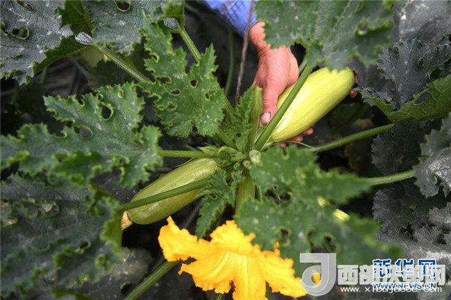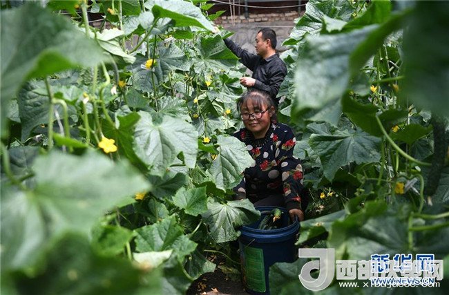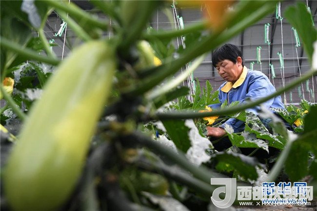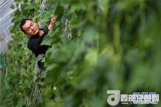4月18日,一位村民在甘肅省酒泉市肅州區(qū)總寨戈壁農(nóng)業(yè)產(chǎn)業(yè)園的日光溫室內(nèi)采摘蔬菜。