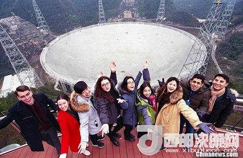 資料圖:留學生在FAST觀景臺合影留念。中新社記者賀俊怡攝