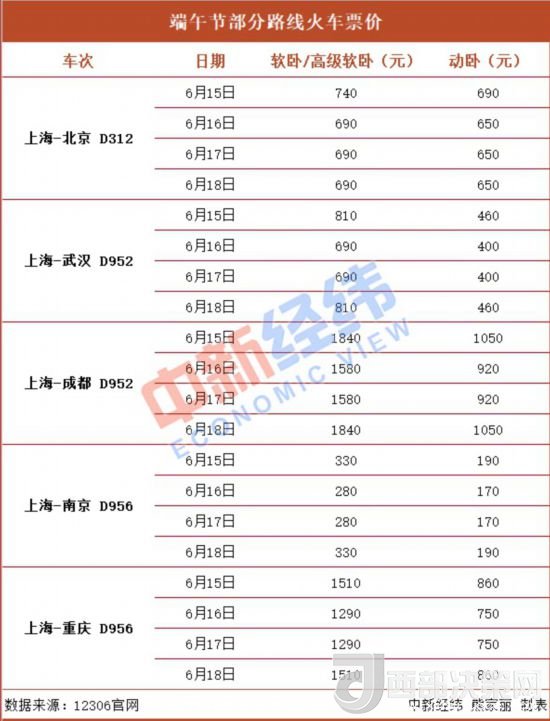 其中,端午節(jié)前一日(15日)和最后一日(18日)的火車票價(jià)格較高,與16日、17日相比,要高出20-260元不等。以上海-成都D952車次為例,15日高級(jí)軟臥票價(jià)比16日高出260元,15日動(dòng)臥票價(jià)比16日高出130元。因此,建議有條件的小伙伴提前或延后出行。