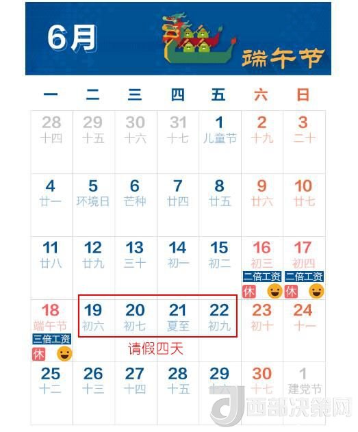 今年端午節(jié)放假時(shí)間為6月16日至18日,共計(jì)3天。中新經(jīng)緯客戶端注意到,只要能在19日-22日請假4天,端午節(jié)便可連休9天。