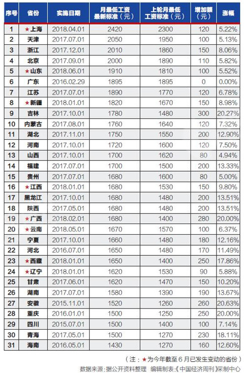 《中國(guó)經(jīng)濟(jì)周刊》記者計(jì)算得出,2018年上調(diào)最低工資標(biāo)準(zhǔn)的8個(gè)省份,平均調(diào)增幅度為9.95%,僅廣西(20.00%)、西藏(17.86%)兩省份的調(diào)增幅度超過(guò)了11%的平均數(shù),廣西的增加額最大,達(dá)280元,西藏的增加額也達(dá)到了250元。