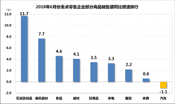 食品、日用品、服裝銷售額同比分別增長4.6%、3.5%和2.2%,家電、建材、家具同比分別增長3.3%、4.1%和0.6%,石油及制品同比增長11.7%,通訊器材同比增長7.7%,汽車同比下降1.1%。
