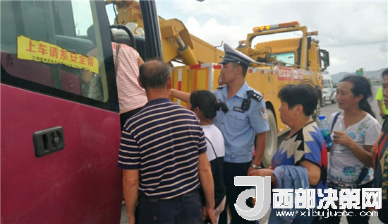 西部決策網(wǎng)-西部大開發(fā)訊(記者帥華鋒 通訊員 馬存福 蘇娟)7月31日上午,甘肅西和縣公安局交警大隊(duì)高速中隊(duì)執(zhí)勤民警巡邏至十天高速西和段上行線天水方向(西和隧道附近),發(fā)現(xiàn)一輛大客車??吭诼愤?,當(dāng)時(shí)高速行駛的車輛川流不息,車輛沒(méi)有停放在安全地帶,存在著極大的安全隱患。民警上前立即查看情況,發(fā)現(xiàn)車輛故障,67名乘客被困于高速,乘客大多數(shù)為婦女與兒童,由于天氣炎熱,長(zhǎng)時(shí)間困于車輛中,情緒焦急不安,存在諸多不安全因素,見(jiàn)此情況,民警立即在故障車輛兩百米外設(shè)置安全提示牌,擺放錐桶,現(xiàn)場(chǎng)指揮過(guò)往車輛,提醒車輛減速慢行,做好防護(hù)的同時(shí),利用巡邏警車將車上乘客有序轉(zhuǎn)移到一公里外的停車區(qū),積極聯(lián)系高速公路救援中心將故障車輛進(jìn)行拖移,盡快撤離高速,恢復(fù)交通秩序。