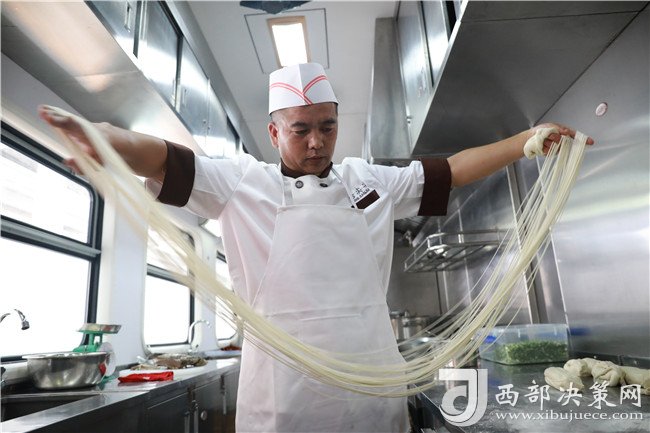 西部決策網(wǎng)——西部大開發(fā)訊 (記者帥華鋒 杜杰 通訊員 強(qiáng)科 宋佳龍/攝影) “終于在火車上吃上了期盼已久的正宗的蘭州牛肉面,給鐵路點(diǎn)個(gè)贊。”8月28日,在蘭州鼎鼎有名的“舌尖尖牛肉面”正式入駐蘭州開往敦煌的Y667/8次列車。記者看到,在拉面大師的嫻熟“表演”下,一碗碗撒發(fā)著濃郁香味的牛肉面被端上了列車餐桌。至此,蘭州牛肉面坐火車開啟了舌尖上的“絲路之旅”。