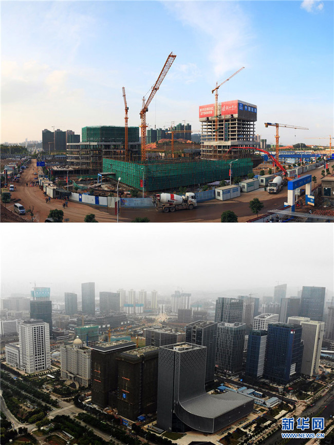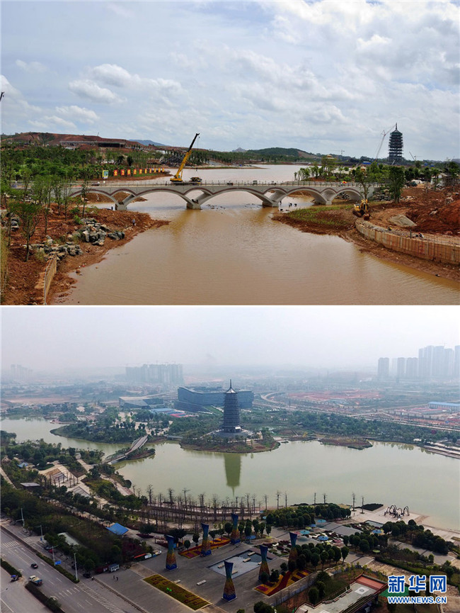 拼版照片。上圖為建設(shè)中的廣西南寧市五象新區(qū)(2016年5月2日,新華社發(fā) 任鵬飛 攝);下圖為無人機航拍五象新區(qū)的廣西文化藝術(shù)中心(2018年10月22日,新華網(wǎng) 章佳禮 攝)