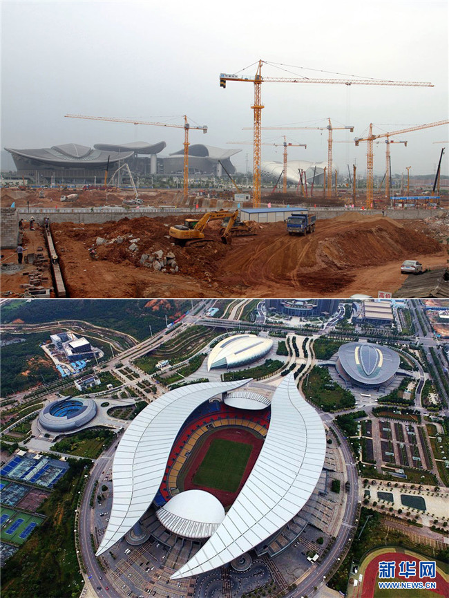 拼版照片。上圖為施工中的廣西體育中心三期工程(2013年4月27日攝);下圖為無人機航拍的廣西體育中心比賽場館(2018年10月22日,新華網(wǎng) 章佳禮 攝)