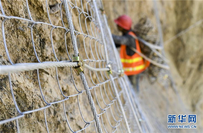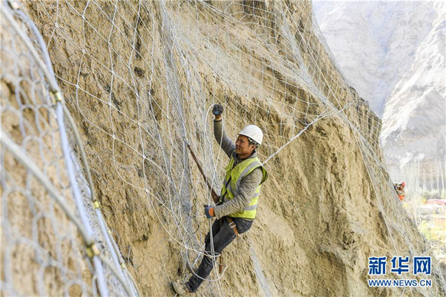 11月12日,在新疆塔什庫(kù)爾干塔吉克自治縣大同鄉(xiāng)阿依克日克村的一處路段,工人在峭壁上安裝防護(hù)網(wǎng)。 近日,一支由四川、云南等地工人組成的施工隊(duì)忙碌在帕米爾高原深處的大山中,為塔什庫(kù)爾干塔吉克自治縣縣城至大同鄉(xiāng)道路的易落石路段安裝防護(hù)網(wǎng)。崇山峻嶺間,工人要攀爬至峭壁上施工作業(yè),如躍動(dòng)在大山間的“舞者”。據(jù)介紹,這支施工隊(duì)常年活躍在新疆山區(qū)道路的施工現(xiàn)場(chǎng),為風(fēng)險(xiǎn)路段加裝安全防護(hù)裝置,保障過往車輛和沿途村民出行安全。 新華社記者 胡虎虎 攝