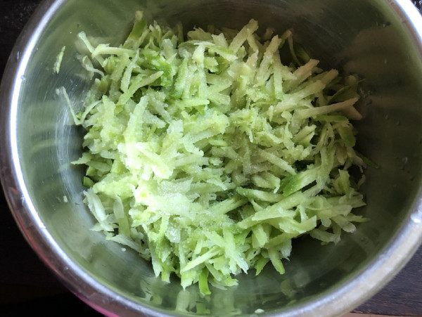 2.用刨子刨成細(xì)絲,加點鹽腌一下出水