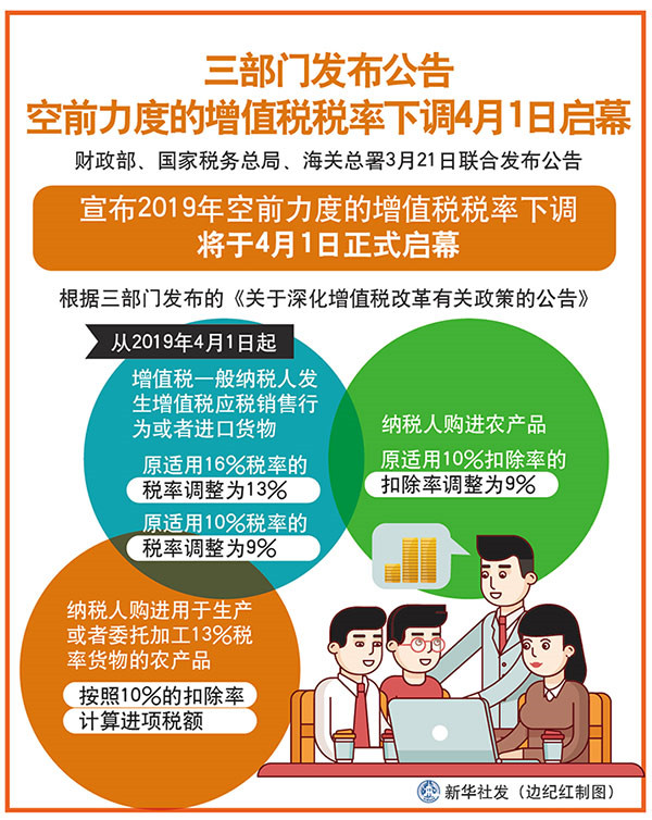 財(cái)政部、國家稅務(wù)總局、海關(guān)總署21日聯(lián)合發(fā)布公告,宣布今年空前力度的增值稅稅率下調(diào)將于4月1日正式啟幕,并公布了一系列深化增值稅改革的配套舉措。