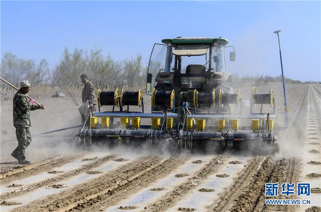 在新疆生產(chǎn)建設(shè)兵團(tuán)第六師共青團(tuán)農(nóng)場(chǎng)的棉花地中,一名農(nóng)場(chǎng)職工在無(wú)人駕駛精量播種機(jī)播種之后的棉田上,檢查地膜表面壓土情況(4月22日攝)。