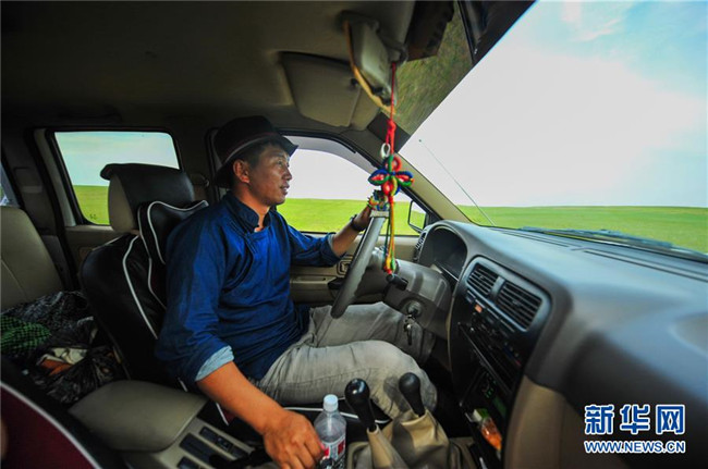 2017年7月17日,內(nèi)蒙古自治區(qū)新巴爾虎右旗克爾倫蘇木芒來(lái)嘎查黨支部書(shū)記米吉格駕車行駛在牧場(chǎng)上。新華社記者 連振 攝