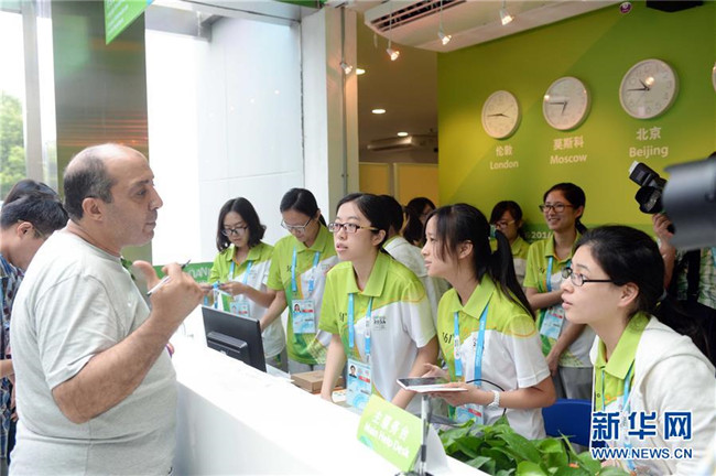 2014年8月14日, 2014南京青奧會(huì)志愿者在主媒體中心回答一名外國(guó)記者的咨詢。新華社記者陳曄華攝