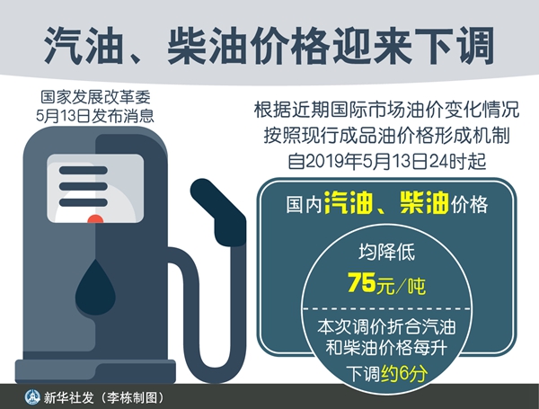 國內汽油、柴油價格將迎來下調。國家發(fā)展改革委13日發(fā)布消息,根據近期國際市場油價變化情況,按照現(xiàn)行成品油價格形成機制,自2019年5月13日24時起,國內汽油、柴油價格每噸均降低75元。