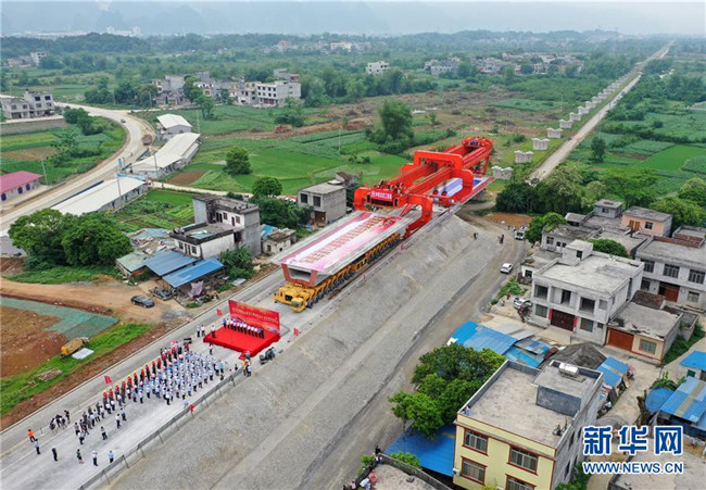 在廣西都安瑤族自治縣貴南高鐵澄江雙線特大橋施工現(xiàn)場(chǎng),工人在架設(shè)大橋首榀箱梁(4月29日無人機(jī)拍攝)。 新華社記者 陸波岸 攝