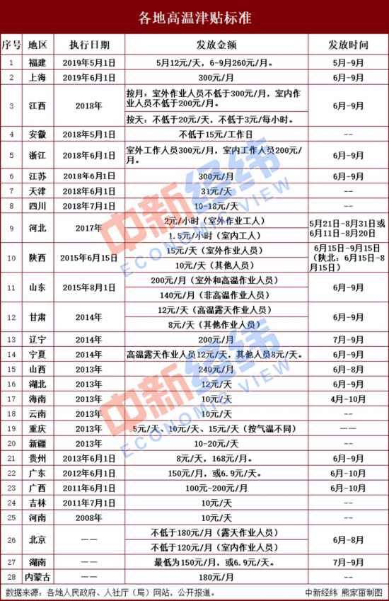 此外,2012年施行的《防暑降溫措施管理辦法》中明確規(guī)定,高溫津貼標準由省級人力資源社會保障行政部門會同有關部門制定,并根據社會經濟發(fā)展狀況適時調整。中新經緯客戶端梳理目前各地高溫津貼實施辦法發(fā)現,部分省份的高溫津貼標準長達10年未曾改變。