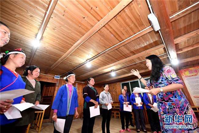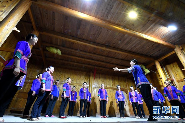 5月27日晚,在廣西柳州市三江侗族自治縣良口鄉(xiāng)燕茶村,吳純娟與村民在戲臺上排練侗族大歌。 今年42歲的吳純娟是廣西柳州市三江侗族自治縣文化館的一名文藝輔導員。她從小喜歡唱歌,工作后接觸并喜歡上侗族大歌,2005年起專門拜師學唱侗族大歌。如今,侗族大歌成為她主要輔導和傳承的音樂之一。今年3月中旬,她成為三江縣良口鄉(xiāng)燕茶村一名駐村工作隊員,侗族大歌是她扶貧的法寶。 燕茶村位于侗鄉(xiāng)大山深處的山腰上,村民們雖然熱愛歌舞,但卻無人會唱侗族大歌。吳純娟進村后,當即在村里開設了侗族大歌免費培訓班,利用晚上及其他工作之余的時間教村民唱侗族大歌,受到村民歡迎。如今,燕茶村專門成立“侗族大歌文藝隊”,隊員從一開始的20人迅速發(fā)展到33人。村部會議室、村里的戲臺、還有山上的千畝茶園……他們的歌聲幾乎傳遍了燕茶村的每個角落。 “這段時間,吳老師還利用休息時間教學校老師和學生唱侗族大歌。”燕茶村燕子小學老師楊雪連說,學校里從來沒有音樂老師,吳老師在學校里開班,師生們學習熱情也非常高。 吳純娟說:“每首侗族大歌歌唱的都是自然、勞動和愛情之美,傳承民族文化的同時,我更希望激發(fā)貧困山區(qū)群眾對美好生活的向往,提高自信,共同脫貧致富。”據(jù)了解,侗族大歌是侗族地區(qū)一種多聲部、無指揮、無伴奏、自然和聲的原生態(tài)音樂。2005年,侗族大歌被列入我國第一批非物質文化遺產名錄,2009年被列入世界人類非物質文化遺產代表作名錄。