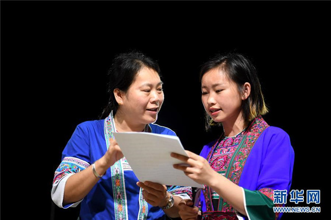 5月27日晚,在廣西柳州市三江侗族自治縣良口鄉(xiāng)燕茶村戲臺前,吳純娟(左)對楊雪連進行發(fā)音指導。