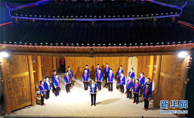 5月27日晚,在廣西柳州市三江侗族自治縣良口鄉(xiāng)燕茶村,吳純娟(前排中)與村民在戲臺上排練侗族大歌(無人機拍攝)。