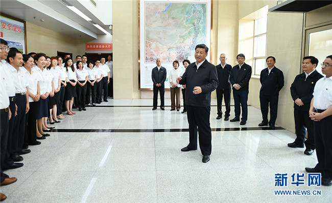 7月15日至16日,中共中央總書記、國家主席、中央軍委主席習近平在內蒙古考察并指導開展“不忘初心、牢記使命”主題教育。這是16日,習近平在內蒙古自治區(qū)自然資源廳調研指導開展“不忘初心、牢記使命”主題教育。 新華社記者 謝環(huán)馳 攝