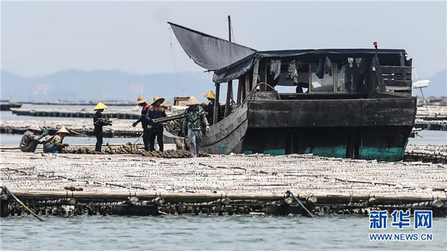 在欽州市龍門港標(biāo)準化大蠔吊養(yǎng)基地,村民在將已經(jīng)收取的蠔柱裝船(7月20日攝)。 新華社記者 張愛林 攝