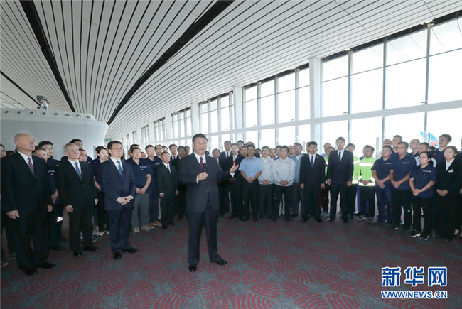 大興機(jī)場航站樓,是目前全球最大規(guī)模的單體航站樓,以其獨(dú)特的造型設(shè)計(jì)、精湛的施工工藝、便捷的交通組織、先進(jìn)的技術(shù)應(yīng)用,創(chuàng)造了許多世界之最。航站樓里,流線型的空間結(jié)構(gòu)十分寬敞明亮。習(xí)近平步行巡覽站臺(tái)大廳和值機(jī)大廳,實(shí)地了解值機(jī)、安檢、登機(jī)和殘疾人無障礙設(shè)施等情況,并結(jié)合沙盤和模型聽取機(jī)場總體規(guī)劃、設(shè)施建設(shè)等介紹。習(xí)近平強(qiáng)調(diào),大興國際機(jī)場是首都的重大標(biāo)志性工程,是推動(dòng)京津冀協(xié)同發(fā)展的骨干工程。京津冀三地要抓住機(jī)遇加強(qiáng)協(xié)同合作,加快推動(dòng)地區(qū)高質(zhì)量發(fā)展。民航業(yè)是國家重要的戰(zhàn)略產(chǎn)業(yè)。要建設(shè)更多更先進(jìn)的航空樞紐、更完善的綜合交通運(yùn)輸系統(tǒng),加快建設(shè)交通強(qiáng)國。