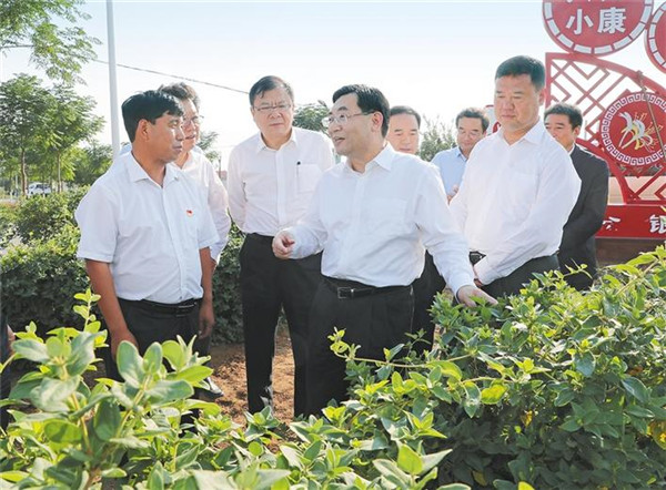 9月25日,省委書記胡和平來(lái)到蒲城縣堯山鎮(zhèn)閆家村金銀花現(xiàn)代農(nóng)業(yè)園區(qū),察看金銀花長(zhǎng)勢(shì),了解畝產(chǎn)、收益和帶動(dòng)脫貧致富效果。記者 宋紅梅攝