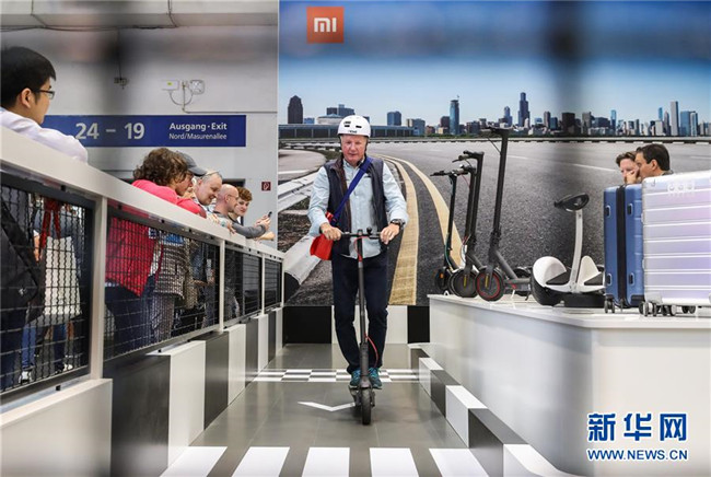 在德國(guó)首都柏林舉辦的第59屆柏林國(guó)際消費(fèi)電子展上,一名參觀者在小米公司展區(qū)體驗(yàn)電動(dòng)滑板車(9月6日攝)。新華社記者單宇琦攝