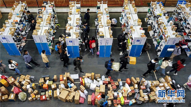南京航空航天大學(xué)師生在校園臨時(shí)快遞取件點(diǎn)領(lǐng)取快遞(2018年11月13日攝)。為應(yīng)對“雙十一”大量校園快遞包裹,南京航空航天大學(xué)在原“快遞超市”的基礎(chǔ)上,將學(xué)校體育中心室內(nèi)網(wǎng)球場搭建為臨時(shí)快遞取件點(diǎn),方便在校師生取件。新華社記者 李博 攝