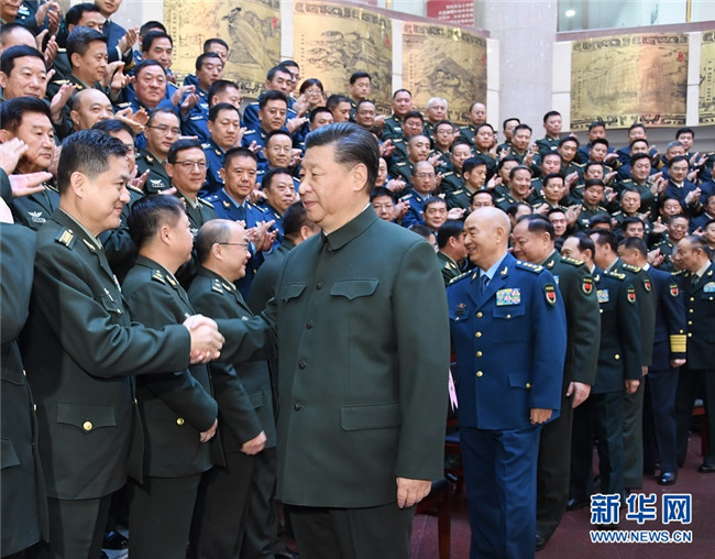 11月27日上午,全軍院校長(zhǎng)集訓(xùn)在國(guó)防大學(xué)開班。中共中央總書記、國(guó)家主席、中央軍委主席習(xí)近平出席開班式并發(fā)表重要講話,代表黨中央和中央軍委,向全軍院校長(zhǎng)和軍事教育戰(zhàn)線的同志們致以誠(chéng)摯問(wèn)候。這是習(xí)近平親切接見集訓(xùn)班全體學(xué)員。 新華社記者 李剛 攝