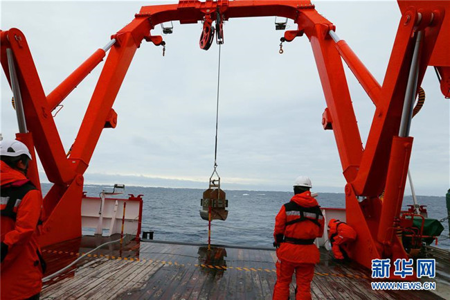 12月9日,科考隊員首次利用“雪龍2”號月池系統(tǒng)進行CTD采水作業(yè)。 新華社記者 劉詩平 攝