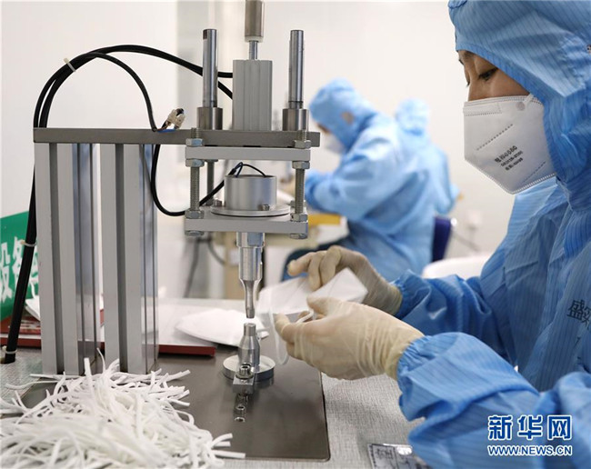 沈陽盛實醫(yī)療科技有限公司工人在為醫(yī)用防護級N95口罩焊接耳套(2月8日攝)。 新華社記者 姚劍鋒 攝