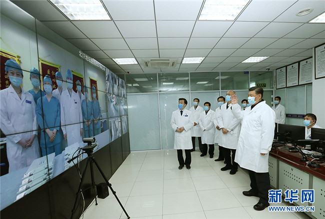 2月10日,中共中央總書(shū)記、國(guó)家主席、中央軍委主席習(xí)近平在北京調(diào)研指導(dǎo)新冠肺炎疫情防控工作。這是習(xí)近平在首都醫(yī)科大學(xué)附屬北京地壇醫(yī)院遠(yuǎn)程診療中心,通過(guò)視頻連線武漢市收治新冠肺炎患者的金銀潭醫(yī)院、協(xié)和醫(yī)院、火神山醫(yī)院,了解情況、聽(tīng)取意見(jiàn)和建議,慰問(wèn)一線醫(yī)務(wù)工作者。 新華社記者 謝環(huán)馳 攝