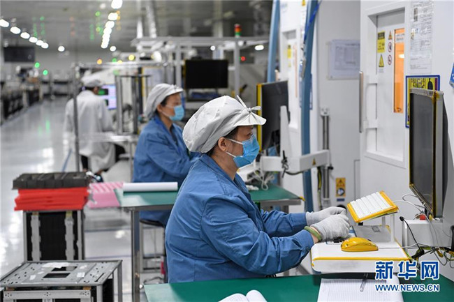 在位于深圳市龍崗區(qū)的海能達(dá)通信有限公司,工人們?cè)谏a(chǎn)車(chē)間工作(2月10日攝)。新華社記者 梁旭 攝