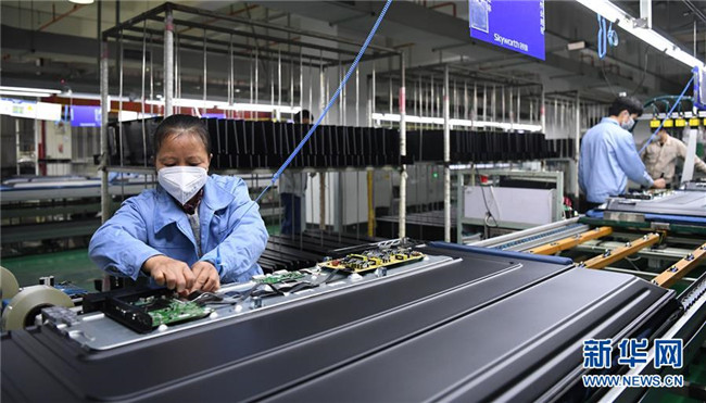 在位于廣州開(kāi)發(fā)區(qū)的廣州創(chuàng)維平面顯示科技有限公司生產(chǎn)車(chē)間內(nèi),工人們?cè)诹魉€(xiàn)上作業(yè)(2月10日攝)。新華社記者 鄧華 攝