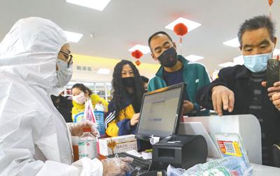 疫情期間,人們對(duì)自己的健康狀況更加關(guān)注。圖為在山東省臨沂市沂蒙路一家醫(yī)藥零售連鎖店內(nèi),消費(fèi)者正在購買防護(hù)口罩和酒精消毒液。人民視覺