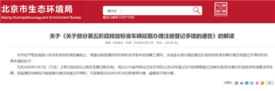 近日,北京市生態(tài)環(huán)境局發(fā)布《關(guān)于<關(guān)于部分第五階段排放標(biāo)準(zhǔn)車輛延期辦理注冊登記手續(xù)的通告>的解讀》指出,凡在2020年1月1日之前已購買的、或已從外省市轉(zhuǎn)出遷往本市的符合“國五”排放標(biāo)準(zhǔn)要求的車輛,因疫情防控期間不能按期辦理注冊登記手續(xù)的,可延期至2020年6月30日前繼續(xù)辦理,逾期將不再辦理。