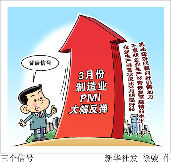 國家統(tǒng)計(jì)局服務(wù)業(yè)調(diào)查中心、中國物流與采購聯(lián)合會31日發(fā)布數(shù)據(jù),3月份,中國制造業(yè)采購經(jīng)理指數(shù)(PMI)為52%,比上月回升16.3個百分點(diǎn)。制造業(yè)PMI為何大幅反彈?回到榮枯線上方是否意味著經(jīng)濟(jì)企穩(wěn)?記者采訪了相關(guān)部門和專家。