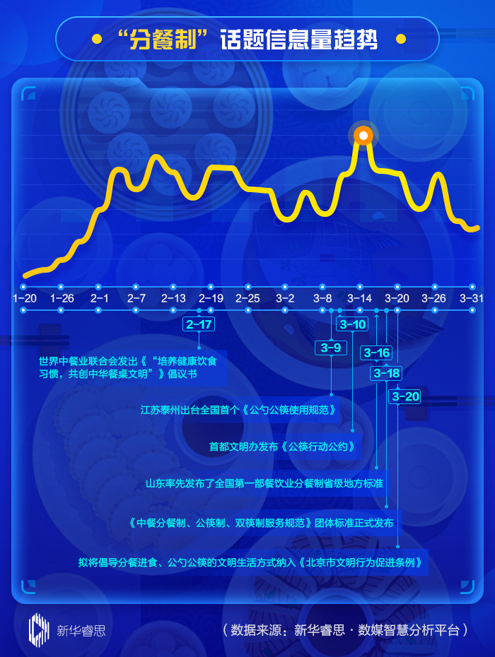 根據新華睿思·數媒智慧分析平臺數據顯示,在最近兩個月來,關于分餐制話題的關注度不斷上升,全國范圍內信息量累計達到1039539條。其中,從話題趨勢演變圖看,3月14日達到輿論熱度的首個峰值(30183條),這與北京、江蘇泰州等地發(fā)布出臺關于公筷使用的文件直接相關。