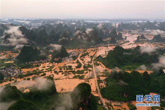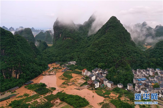 這是廣西陽朔縣部分出現(xiàn)嚴(yán)重積水的村莊(6月7日攝,無人機(jī)照片)。 新華社記者 陸波岸 攝