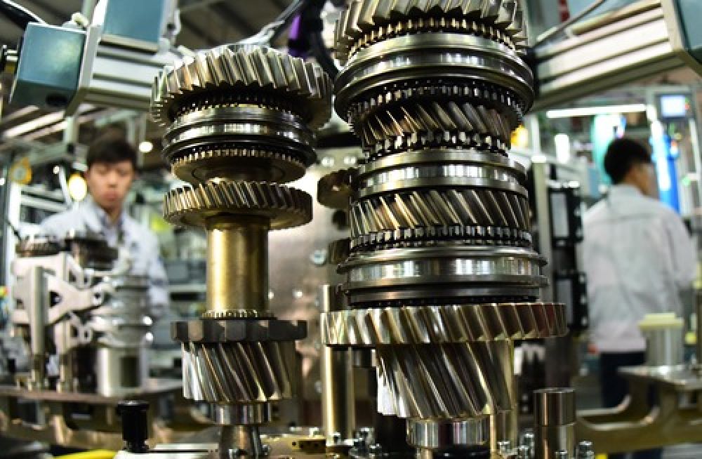 工人在湖北武漢東風格特拉克汽車變速箱有限公司生產線上工作。(新華社記者程敏 攝)