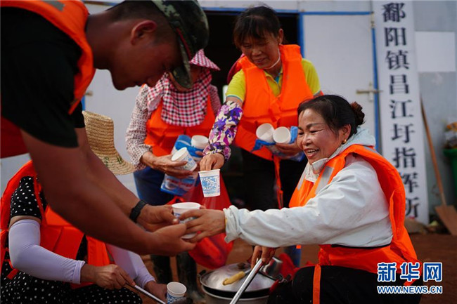 7月11日,在江西省鄱陽縣鄱陽鎮(zhèn)江家?guī)X村,“阿姨團”隊長余風(fēng)英(右一)給武警戰(zhàn)士盛綠豆湯。 新華社記者 周密 攝