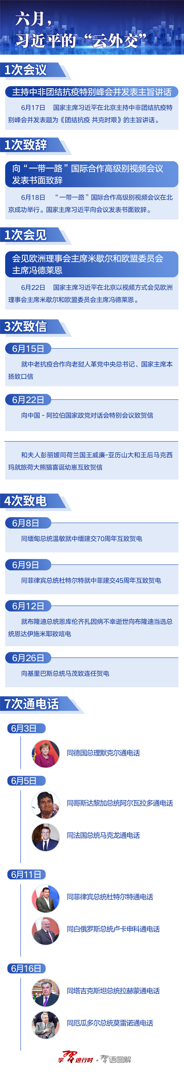 6月,習近平同德國總理默克爾、法國總統(tǒng)馬克龍、哥斯達黎加總統(tǒng)阿爾瓦拉多等外國領(lǐng)導人通電話;向中國-阿拉伯國家政黨對話會特別會議致賀信;以視頻方式主持中非團結(jié)抗疫特別峰會、會見歐洲理事會主席米歇爾和歐盟委員會主席馮德萊恩……