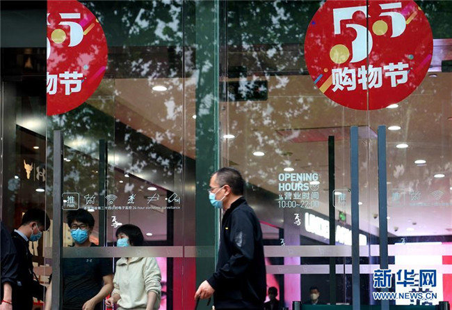 這是上?;春B芬患疑虉龅?ldquo;五五購物節(jié)”標(biāo)識(5月5日攝)。5月4日晚,上海首次啟動大規(guī)模商業(yè)促銷活動“五五購物節(jié)”,多家在線新經(jīng)濟(jì)企業(yè)參與。 新華社記者 劉穎 攝